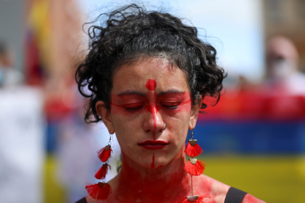 在哥倫比亞首都波哥大(Bogota),反政府示威者舉辦一場呼籲政府積極處理國內貧窮、健保/教育體制系統性歧視、警察暴力等問題的示威。在這場示威上,一名將臉塗上紅色顏料的示威者在人群中閉上眼睛。