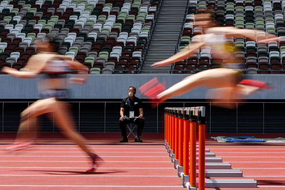 在日本首都東京的奧運體育場(Olympic Stadium)內,一名日本政府的官員戴著口罩,望著從眼前飛奔而過的女子 400公尺跨欄競賽決賽選手。這場比賽是日本政府舉辦的一場試驗性賽事,當局希望借助這類比賽,判斷擬定的防疫措施能否順利發揮成效。