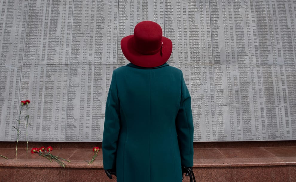 在俄國中南部的城市托木斯克(Tomsk),一名戴著紅帽子的婦女在紀念各國戰勝納粹德國的勝利日(Victory Day)這天,來到一塊二戰紀念牆前,紀念那些在戰爭中死去的人們。