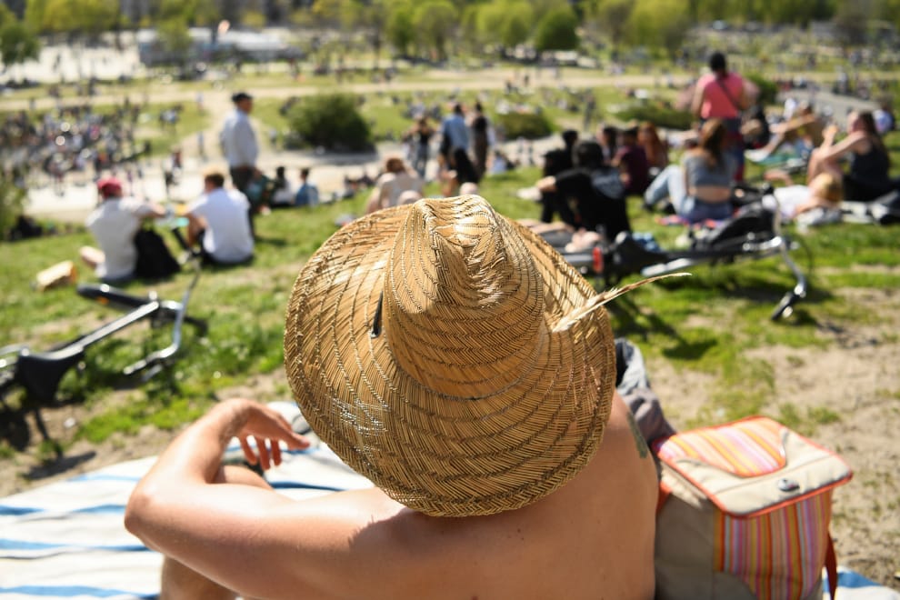 在德國首都柏林,一名遊客趁著大晴天,戴上他的草帽來到毛爾公園(Mauerpark),享受炎炎夏日的美好。