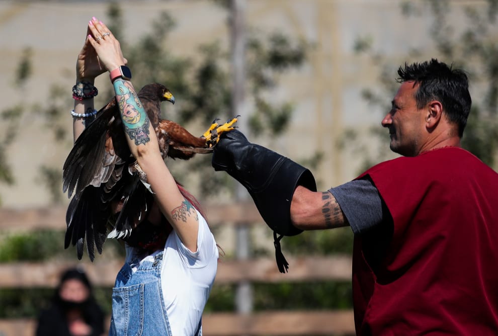 在義大利首都羅馬新開幕的主題樂園「羅馬世界」(Roma World)中,栗翅鷹(Parabuteo unicinctus)飼主亞力山德里尼(Maurizio Alessandrini)伸出手臂,引導他飼養的栗翅鷹與遊客互動。