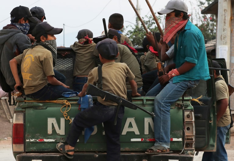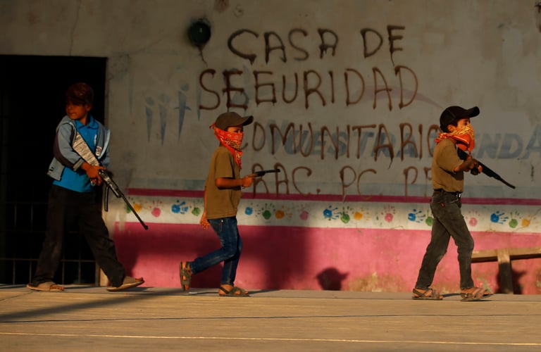 在墨西哥南部緊鄰太平洋的格雷羅州(Guerrero state)阿雅華坦帕村(Ayahualtempa),孩子們通常不是在放羊,就是在和飼養的小狗玩。不過,只要一有媒體進入村莊,他們馬上就會抄起槍枝、穿上社區警察的T恤,跑到社區籃球場列隊供媒體拍照。