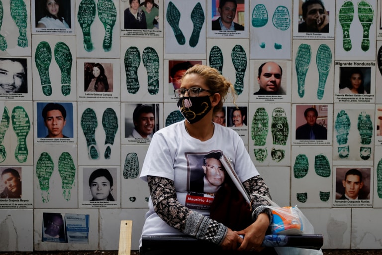 在墨西哥首都墨西哥市的墨西哥檢察總長辦公室(Mexico's General Prosecutor's office)外,兒子至今下落不明的薩爾瓦多拉(Maria Salvadora)坐在一面馬賽克牆前,身後照片的主人翁都和她的兒子一樣,至今生死未卜。