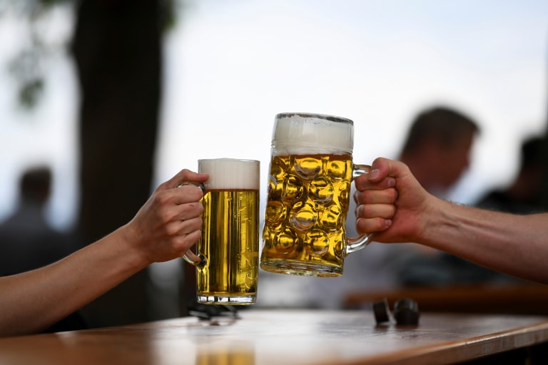 在德國巴伐利亞州阿默湖(Ammersee)畔的小鎮阿默湖畔因寧(Inning am Ammersee),兩名饕客在啤酒館中各自舉起一杯啤酒乾杯。