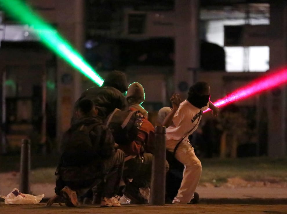 在這場示威中,兩名示威者拿出雷射光發射器,朝著四周發射雷射光。