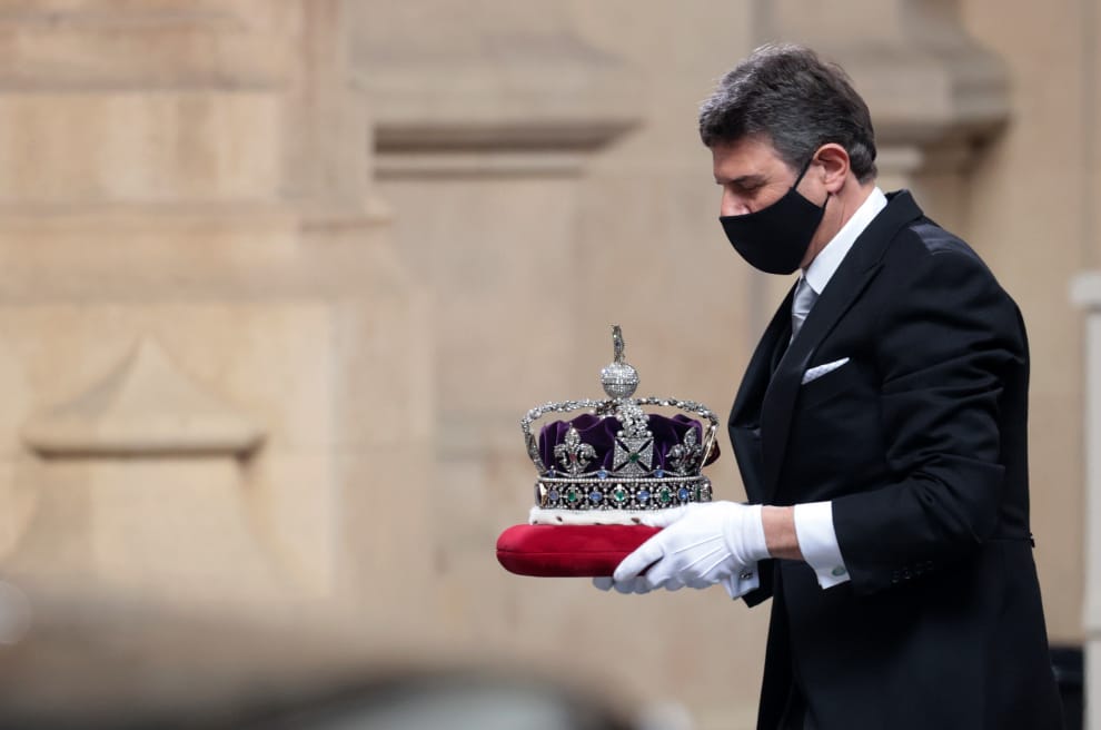 在英國首都倫敦,一名工作人員小心翼翼地捧著英國女王伊莉莎白二世(Elizabeth II)的王冠走進國會,好讓她在主持國會開幕大典(State Opening of Parliament)中使用。