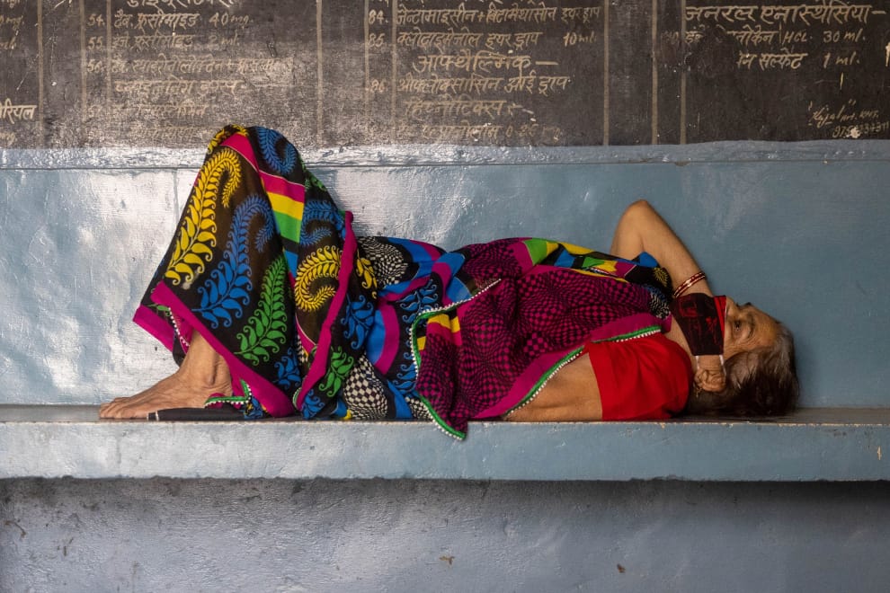 在印度北方邦(Uttar Pradesh)的穆扎法爾納加爾市(Muzaffarnagar),一名呼吸困難的婦女躺在醫療中心外,等著接受治療。