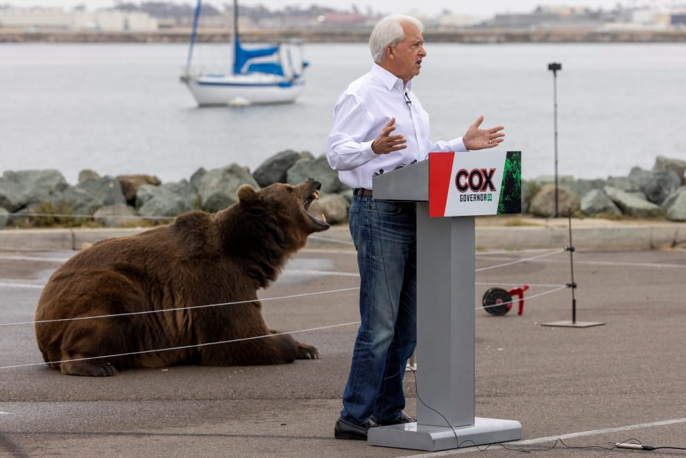 在美國加州的聖地牙哥市(San Diego),加州州長候選人考克斯(John Cox)帶著他的競選好幫手──科迪亞克棕熊(Ursus arctos middendorffi,亦稱阿拉斯加棕熊)「泰戈」(Tag),一起在戶外召開記者會。