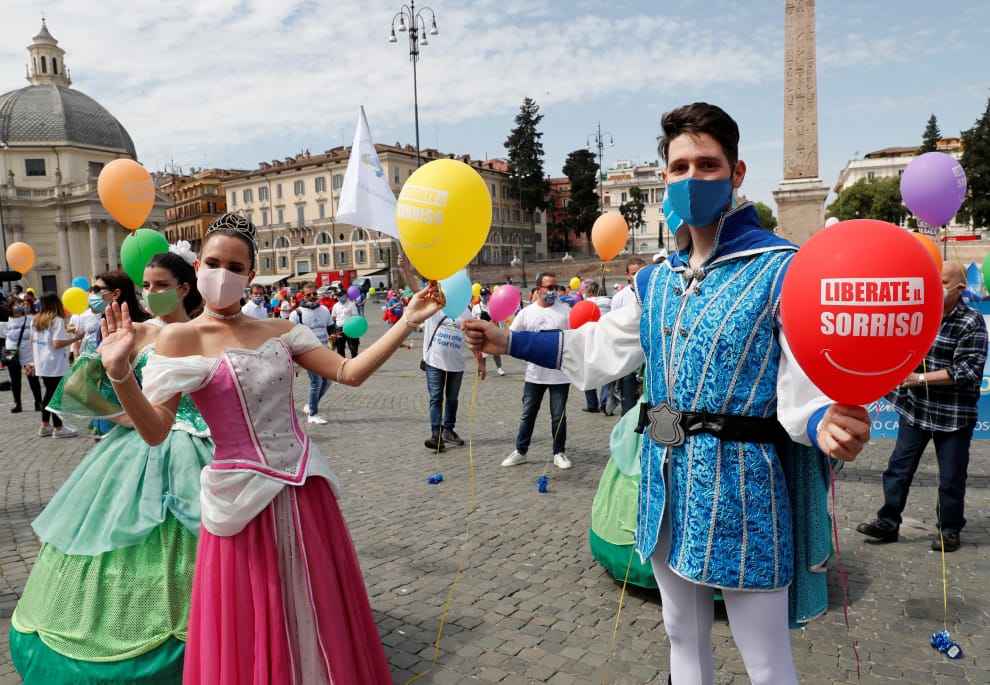 在義大利首都羅馬的人民廣場(Piazza del Popolo),義大利主題公園的從業人員們發動一場示威,希望義大利政府在漸漸放寬防疫管制的同時,也能提供他們更多資源,幫助他們走出過去一年多來的景氣寒冬。
