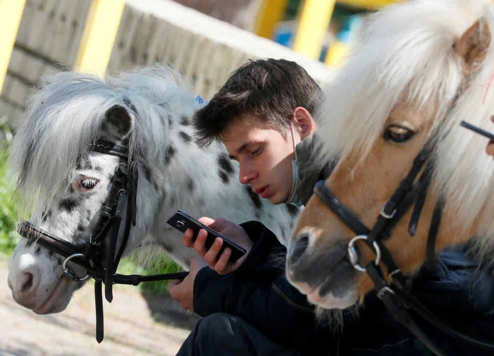 在烏克蘭首都基輔(Kyiv)的一座公園內,一名馬主低頭滑著手機,等待家長們上門花錢讓孩子騎馬。