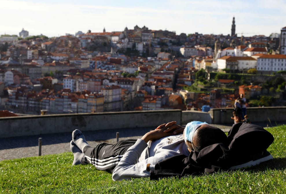 在加亞新城(Vila Nova de Gaia),一名男子悠閒地躺在草地上享受陽光。葡萄牙於 17號這天再度鬆綁它們的疫情措施,只要是來自英國及大部分歐洲國家的遊客,他們在進入葡萄牙時都不再需要進行隔離檢疫。