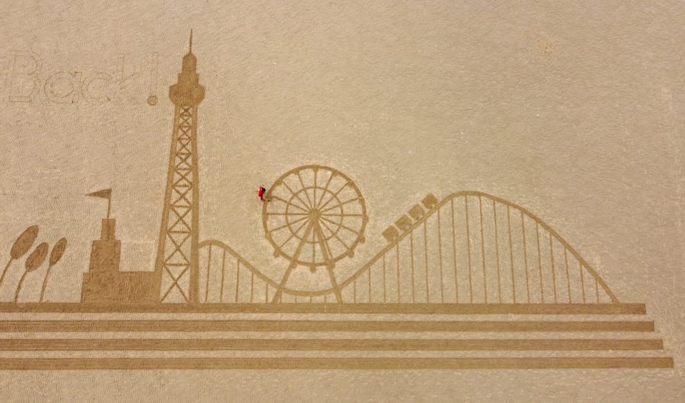 在英國中西部的沿海城市布萊克浦(Blackpool),專門畫出巨大沙畫的公司「你眼中的沙」(Sand In Your Eye)將布萊克浦著名的遊樂園「布萊克浦歡樂海灘」(Blackpool Pleasure Beach)畫在了它附近的沙灘上,左上角還寫著「布萊克浦回來了!」(Blackpool's Back!),以紀念英國COVID-19(武漢肺炎)疫情措施於近日的逐步鬆綁。