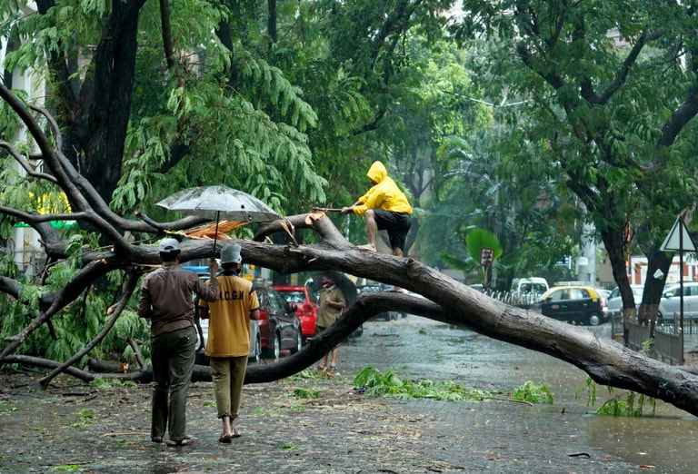 本照攝於馬哈拉施特拉邦的首府孟買(Mumbai),畫面中,一名男子正在鋸斷一棵因強風吹襲而倒在路面上的大樹。