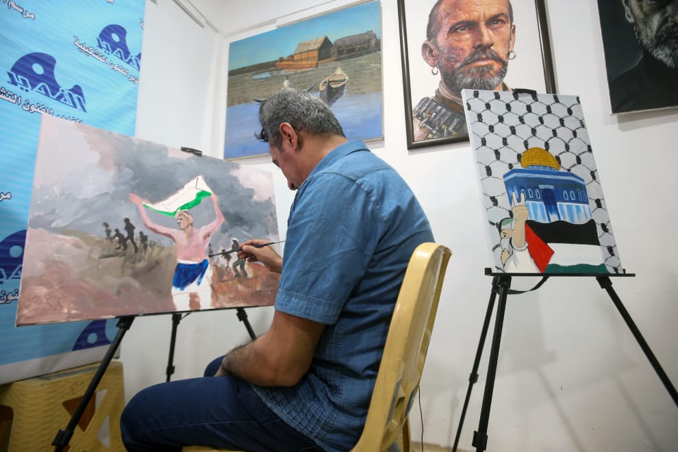 在巴斯拉省(Basra),幾名伊拉克藝術家以作畫的方式支持正與以色列發生激烈衝突的巴勒斯坦人。畫面中,其中一人正在為他的畫作上色,裡頭的巴勒斯坦國旗只塗上了綠色的部分。