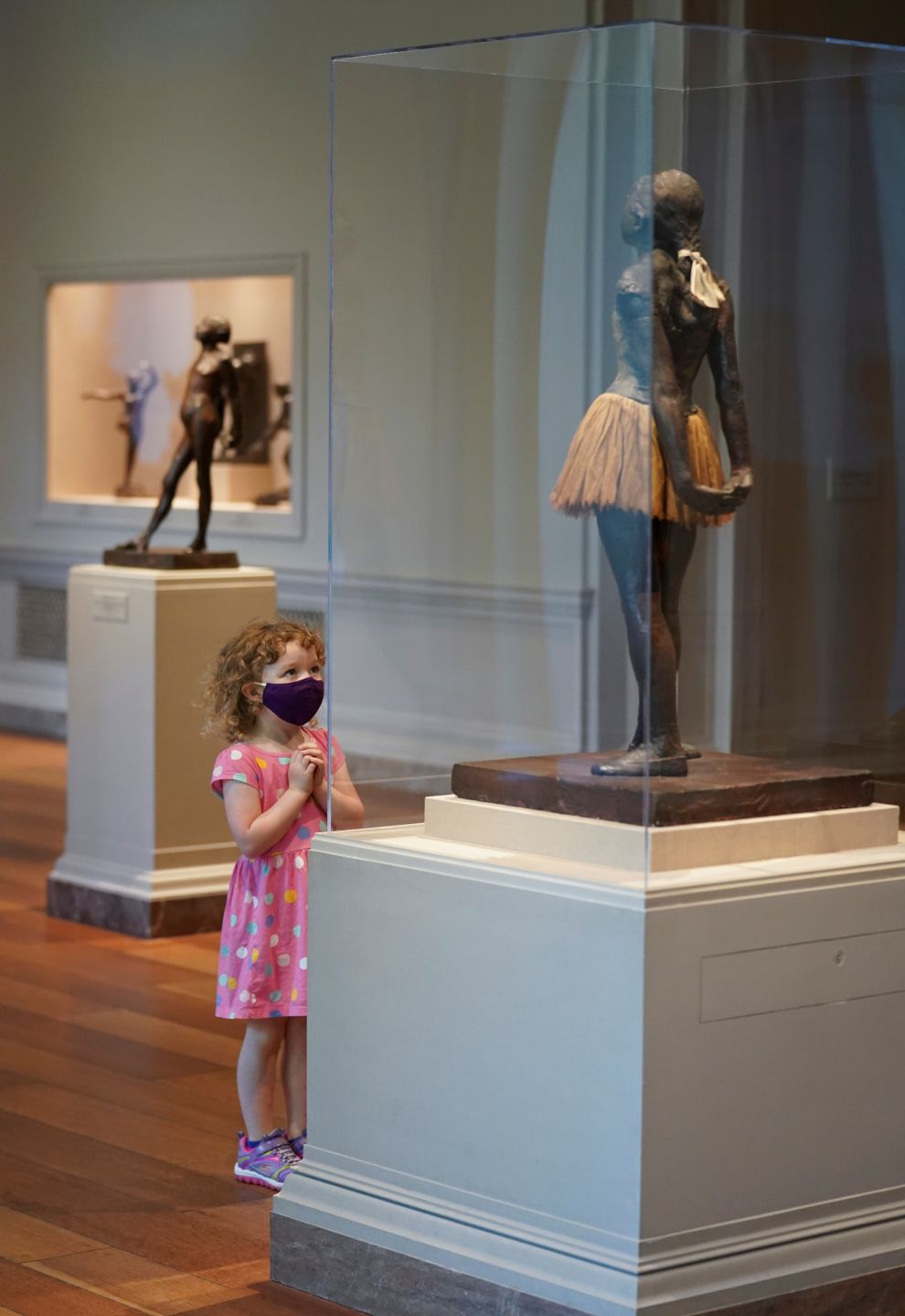 畫面中,一名小女孩正握住自己的雙手,欣賞由 19世紀法國雕塑家竇加(Edgar Degas)所創作的《十四歲的小舞者》(Little Dancer Aged Fourteen)。