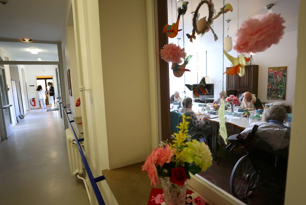 在城市達姆斯塔特(Darmstadt),艾蜜莉亞老年照護中心(Emilia senior residence)正準備要一步步鬆綁防疫措施,讓院內的老人家能夠「重返日常生活」。畫面中,住戶們正在飯廳中一起用餐。