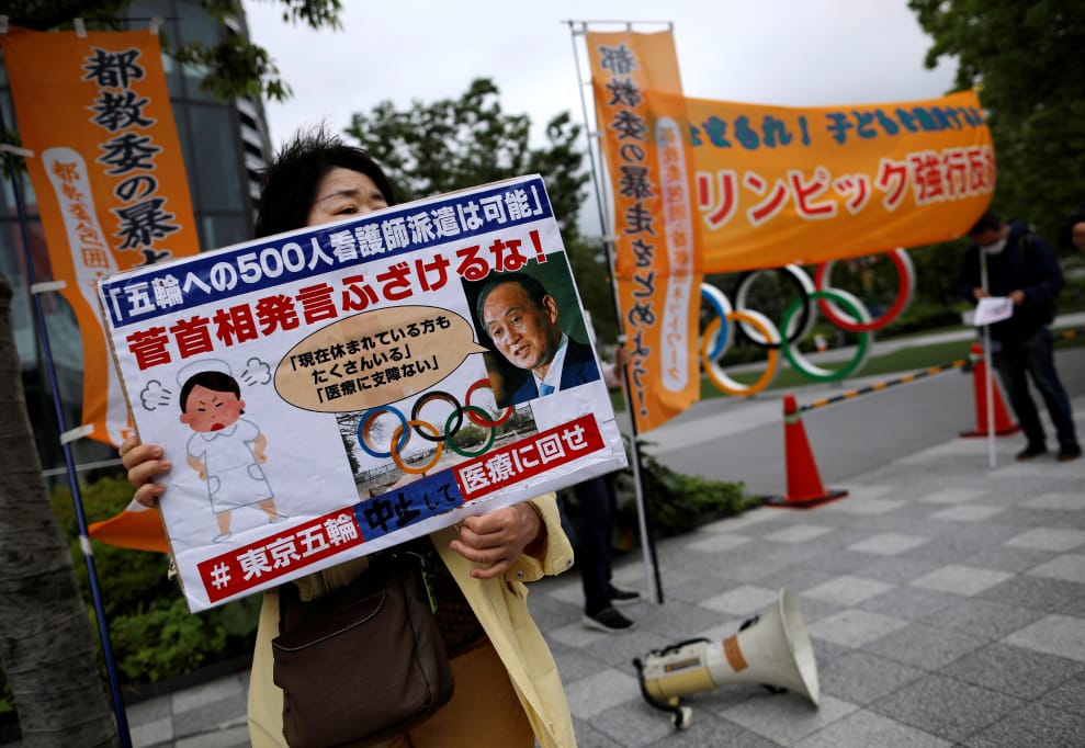 在東京,一群反對日本政府舉辦東京奧運的抗議者們,手持著標語來到了日本奧委會(Japanese Olympic Committee)的總部外頭,甚至還拉起了布條,要求當局正視奧運必然帶來的COVID-19(武漢肺炎)醫療問題。