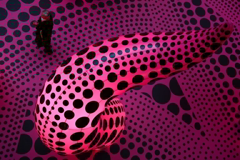 在首都柏林的馬丁葛羅比烏斯博物館(Martin-Gropius-Bau),一名男子走進了展覽《回顧》(A Retrospective),欣賞由日本藝術家草間彌生所構築而出的波點世界。