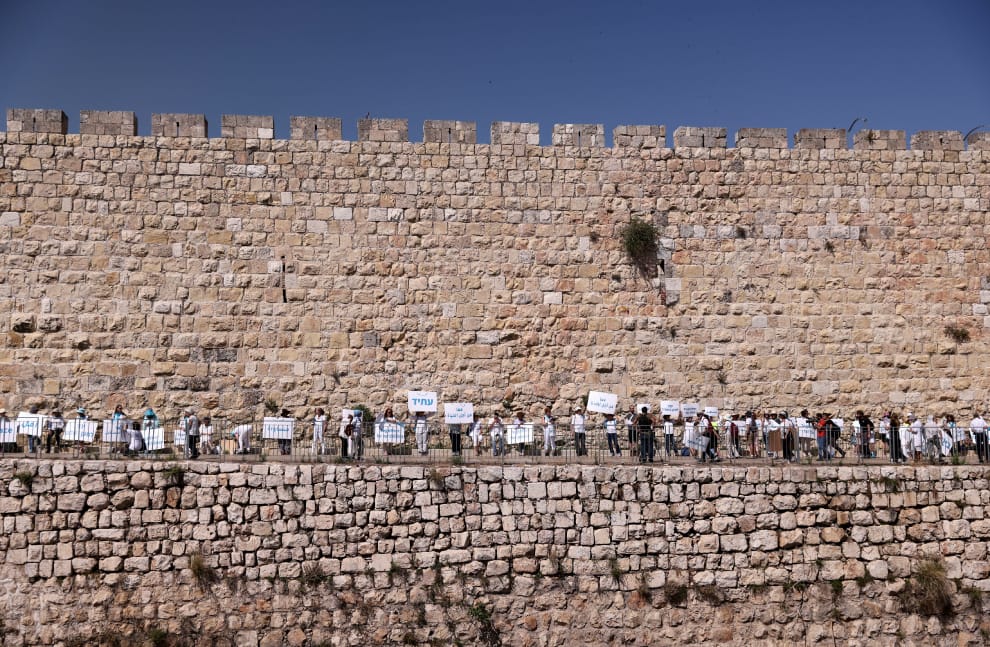 在耶路撒冷(Jerusalem)的舊城區,猶太裔與阿拉伯裔的抗議者們帶著標語來到了城牆下方,他們籲求以色列和巴勒斯坦停止接連不斷的戰爭,並尋找能夠一起共存的方法。