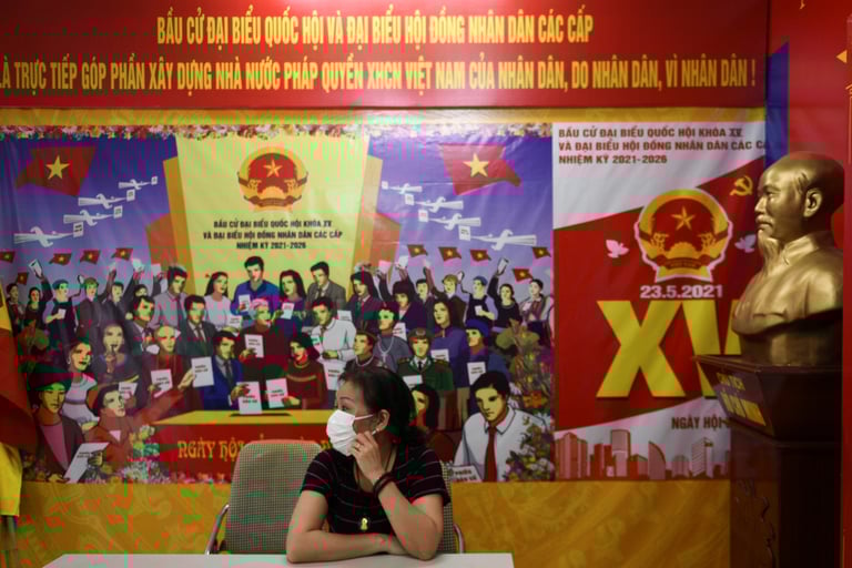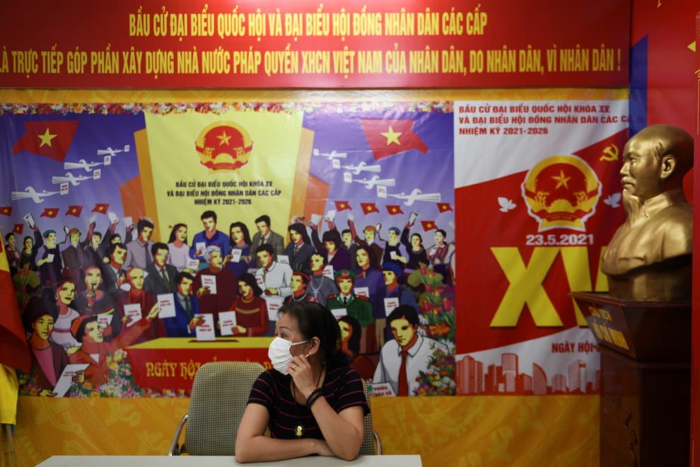本周日(23),越南即將要舉行第 15屆國會代表選舉。因此,在首都河內(Hanoi)一處已經預備好的投開票所,一名選務人員正坐在現場,等待附近居民前往領取選舉相關文件。