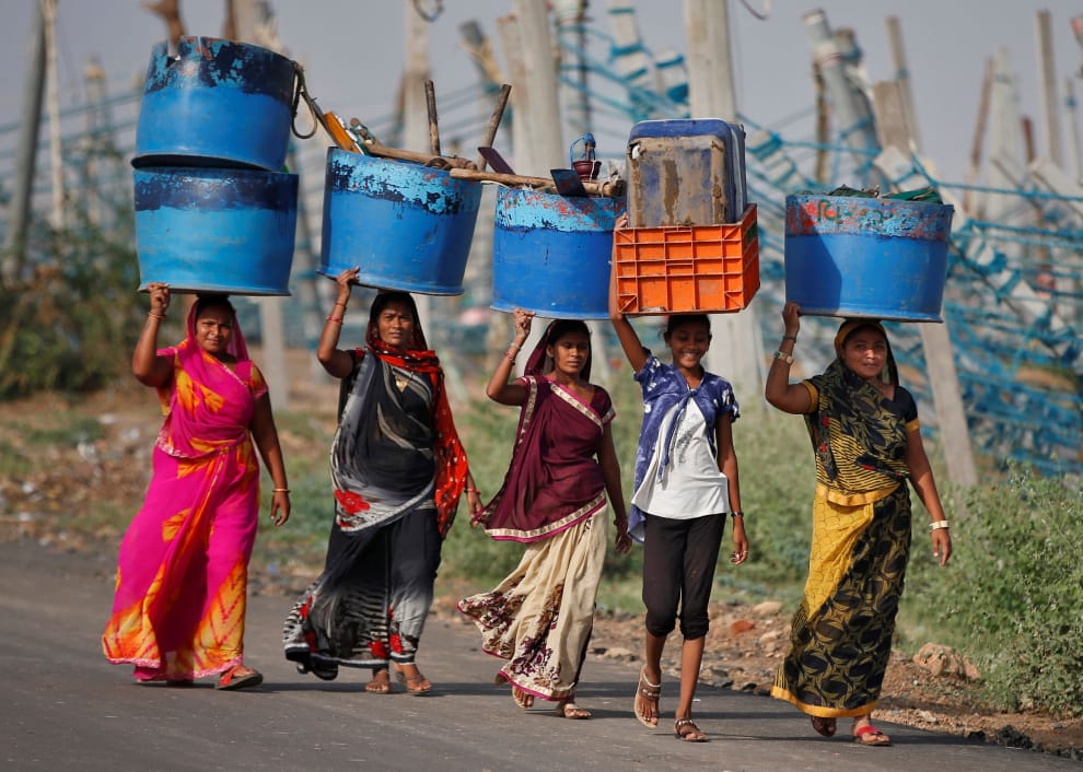 本照則攝於 19號,在古吉拉特邦的城鎮賈夫拉巴德(Jafrabad),一群女子從因氣旋陶特而受損的漁港中,搶救出了自己放在工作地點的物品,並把它們都頂在頭上的桶子裡,準備一路頂回家。