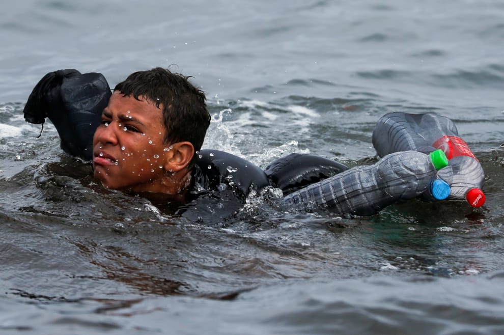 從 17號傍晚開始,在西班牙與摩洛哥比鄰的海外自治領地休達(Ceuta),有數千名來自非洲的移民及難民,以泳渡的方式橫越了兩國的邊界,並嘗試以此方式進入歐洲。畫面中,一名身上綁著空寶特瓶增加浮力的摩洛哥男孩正在海中奮力游著。