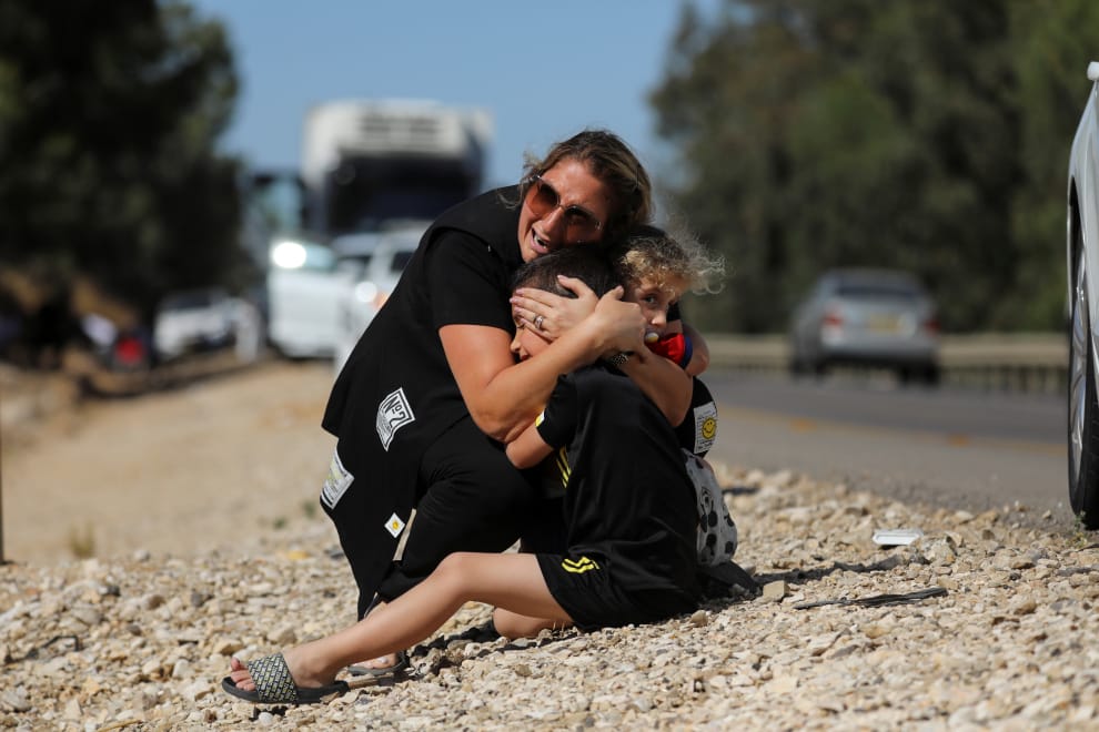 在城市斯德洛特(Sderot)的近郊,一枚飛彈正從加薩走廊發射而來,空襲警報因此響徹天際,許多當地民眾驚慌地尋求掩護,其中一名母親只能無助地在路邊抱住自己的兩個孩子。