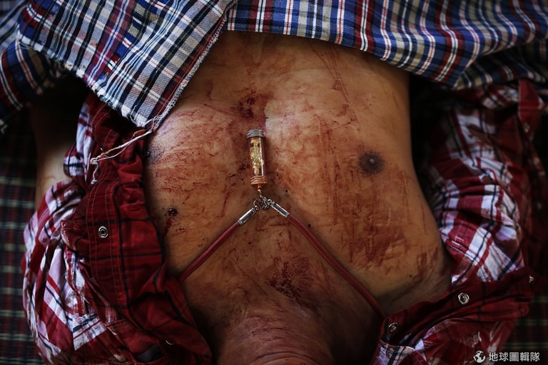 照片中是一名支持政府的紅衫軍民眾,胸口有著血跡和彈痕,他在衝突中遭到槍擊身亡