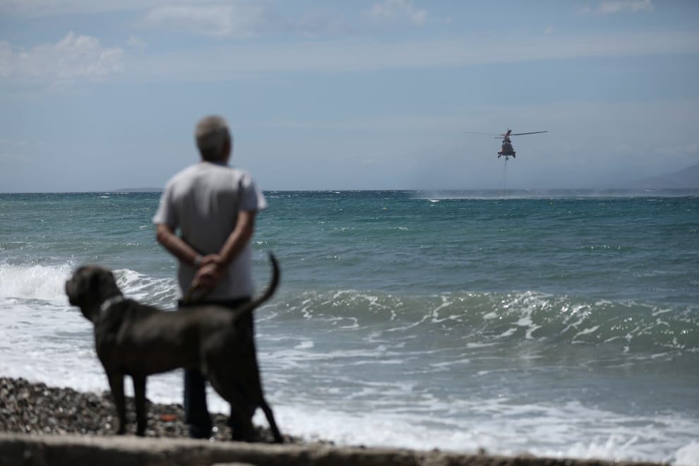 在本照畫面中,一名帶著狗的男子正站在岩灘上,看著遠方的消防用直升機從海中取水,準備要再回到火災現場繼續救火。