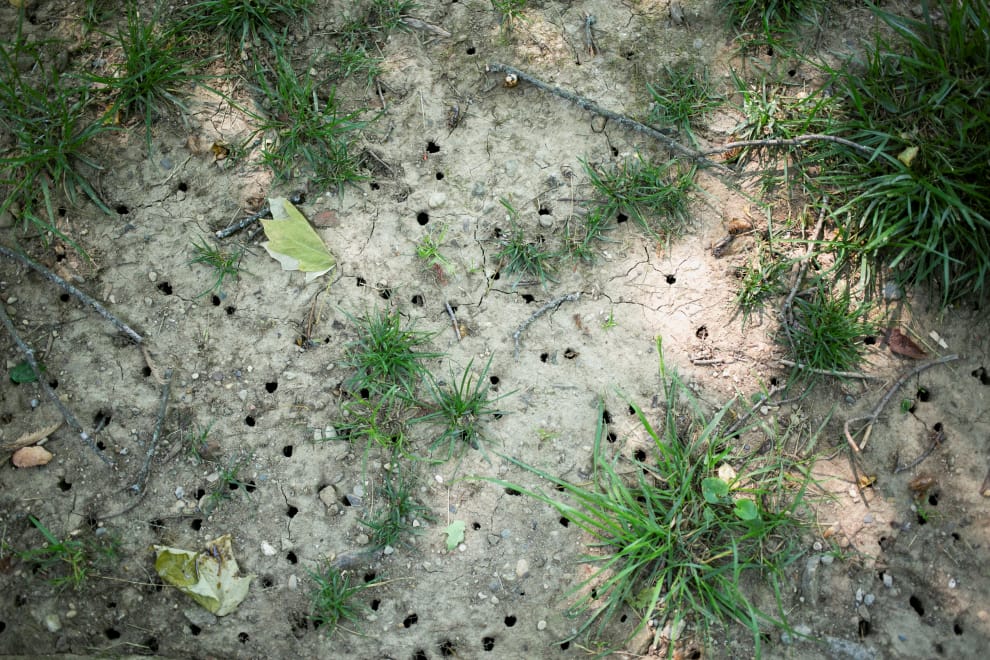 在肯塔基州的城市路易維爾(Louisville),數十億隻於地下蟄伏了 17年的周期蟬「Brood X」在近日開始破土而出,土壤表面因此出現一個個牠們爬出時造成的坑洞。