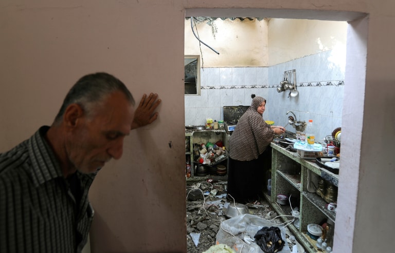 在加薩走廊的加薩市(Gaza),一名巴勒斯坦女子站在因以色列空襲而一片狼藉的廚房中,神情無奈。
