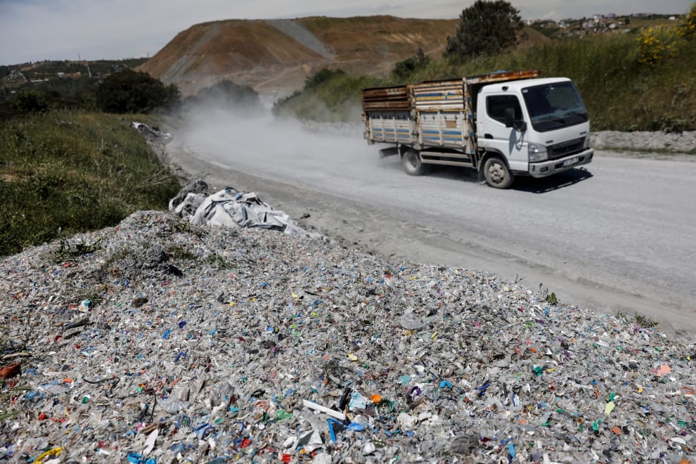 在土耳其,因為當地政府禁止進口塑膠廢料,於是許多從國外被出口到此地的垃圾,便直接被非法傾倒在了路邊。本照攝於大城伊斯坦堡(Istanbul)的阿里貝克伊大壩(Alibeykoy Dam)周邊。