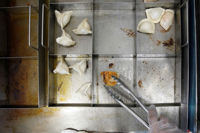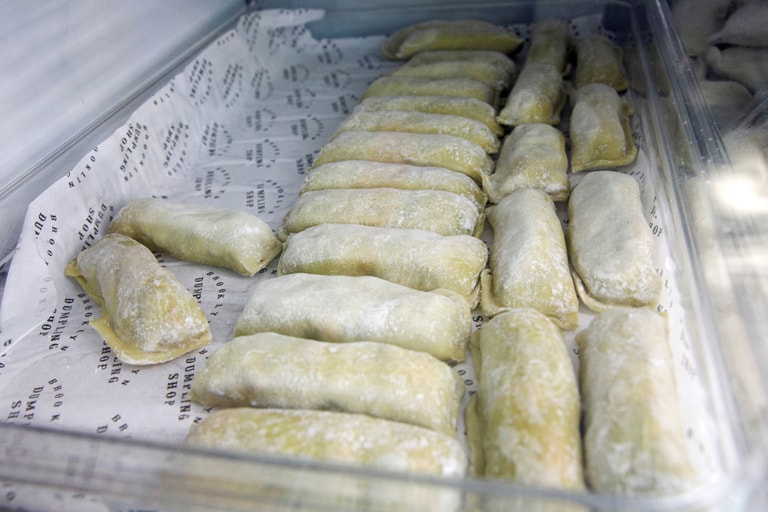 在布魯克林餃子店內的一道玻璃牆後,隨時都會有兩名廚師待命,全天候地製作新鮮餃子,他們會將餃子拿去蒸,又或是拿去煎跟炸,完成之後再直接將熱騰騰的餐點輸送到食物櫃裡,供顧客領取。