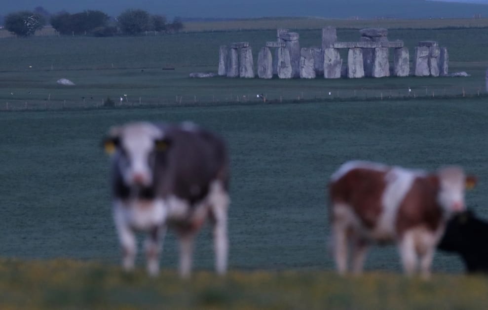 在埃姆斯伯里(Amesbury),一群牛悠悠哉哉地走在世界文化遺產巨石陣(Stonehenge)的附近。
