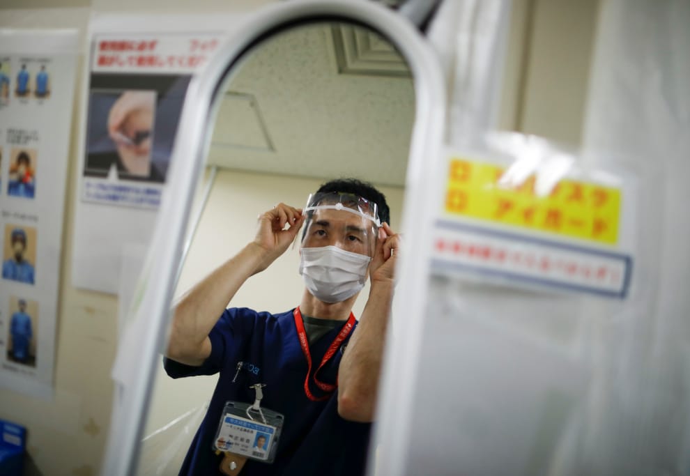 在橫濱市,罹患COVID-19(武漢肺炎)的病患會被送到聖瑪麗安娜大學內附設的橫濱市西部醫院進行救治。畫面中,一名負責急診與重症的該院醫生齋藤宏樹(Hiroki Saito,音譯)正對著鏡子調整自己臉上的PPE防護裝備。