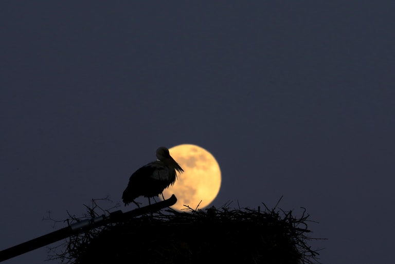 在首都史高比耶(Skopje),一隻鸛鳥站在滿月前方的畫面,被攝影師的鏡頭給捕捉了下來。