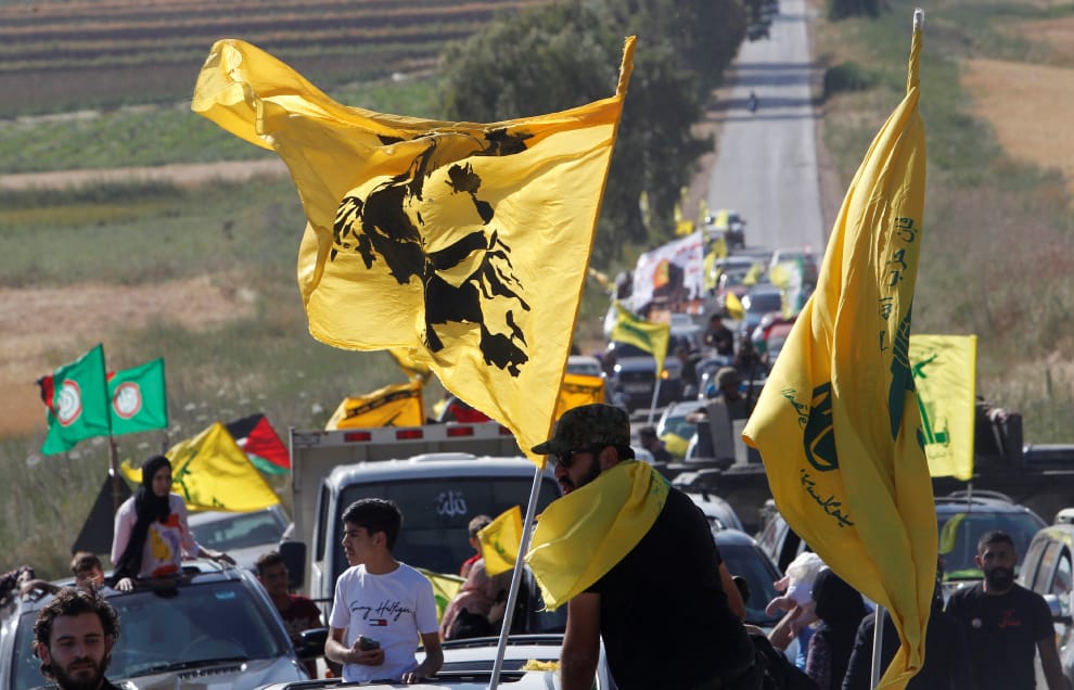 在靠近以色列的南部村莊卡法基拉(Kfar Kila village),一群民眾揮舞著旗幟,於反抗與解放日(Resistance and Liberation Day)這天,表達對真主黨(Hezbollah)領袖納斯魯拉(Sayyed Hassan Nasrallah)的支持。