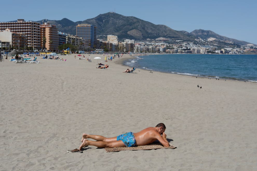 在南部臨地中海的市鎮豐西羅拉(Fuengirola),一名男子正在人潮冷清的沙灘上享受著日光浴。