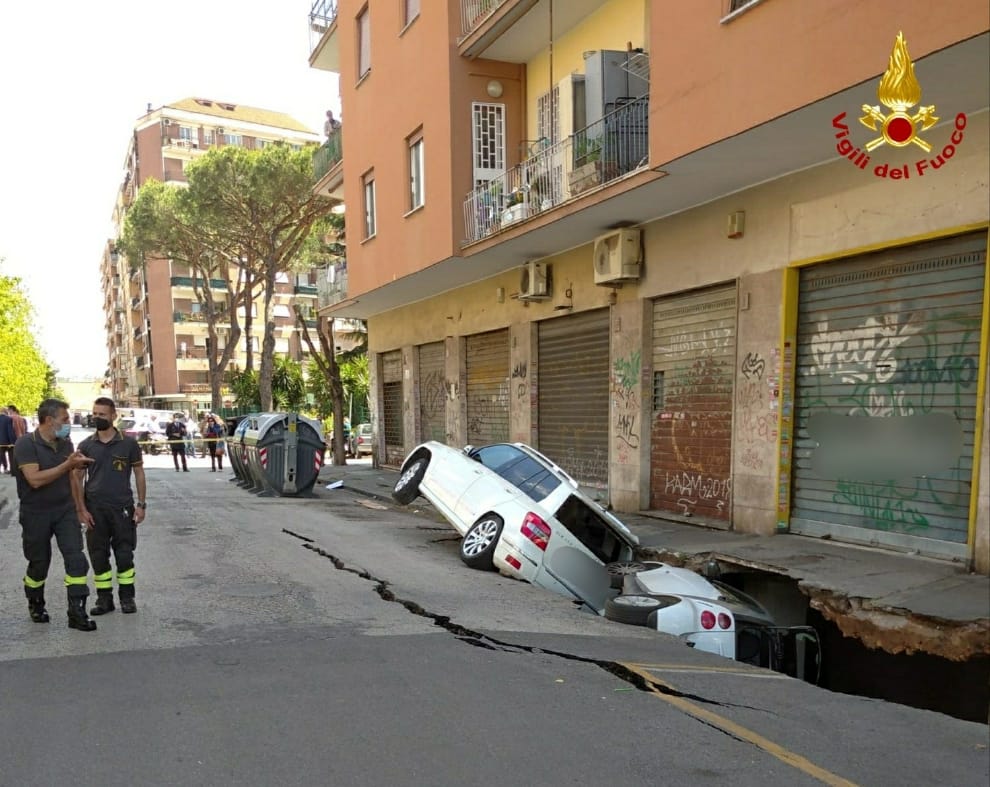 在羅馬,疑似是因為地下車庫漏水的緣故,一處公寓外頭突然出現了長 20公尺、深 6公尺的天坑,雖然本次意外無人受傷,但有兩台不幸的車子就這樣卡進了洞裡。
