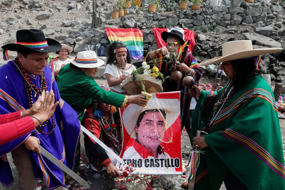 在首都利馬(Lima),一群來自薩滿教的巫師舉行了傳統儀式,並於儀式中預言了 6月6日總統大選的勝出者。畫面中,一名巫師正將發酵的玉米飲料灑在總統候選人卡斯蒂略(Pedro Castillo)的海報上,他們認為卡斯蒂略將成為秘魯的下一任領導人。