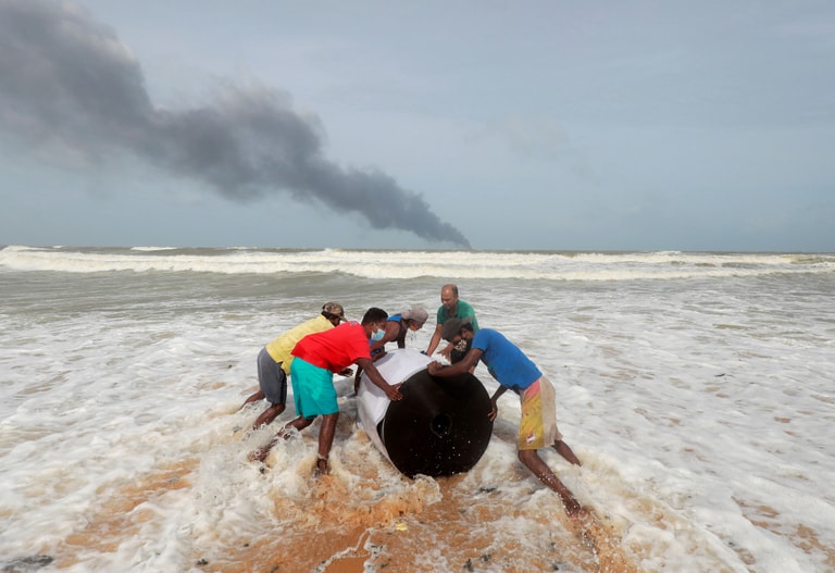 在首都可倫坡的郊區賈埃勒(Ja-Ela),貨輪「MV X-Press Pearl」於可倫坡港(Colombo Harbour)海外起火燃燒,船上的部分貨櫃甚至還落入了海裡。畫面中,附近居民正合力把掉落的貨物一起拉回岸上,而遠方發出的濃煙,則是來自正身陷火海之中的「MV X-Press Pearl」。