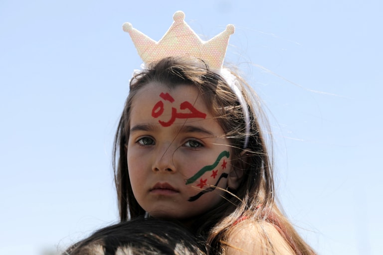 畫面中,一名在伊德利卜隨家人參加抗議的小女孩,臉頰被畫上了反對派的旗幟。