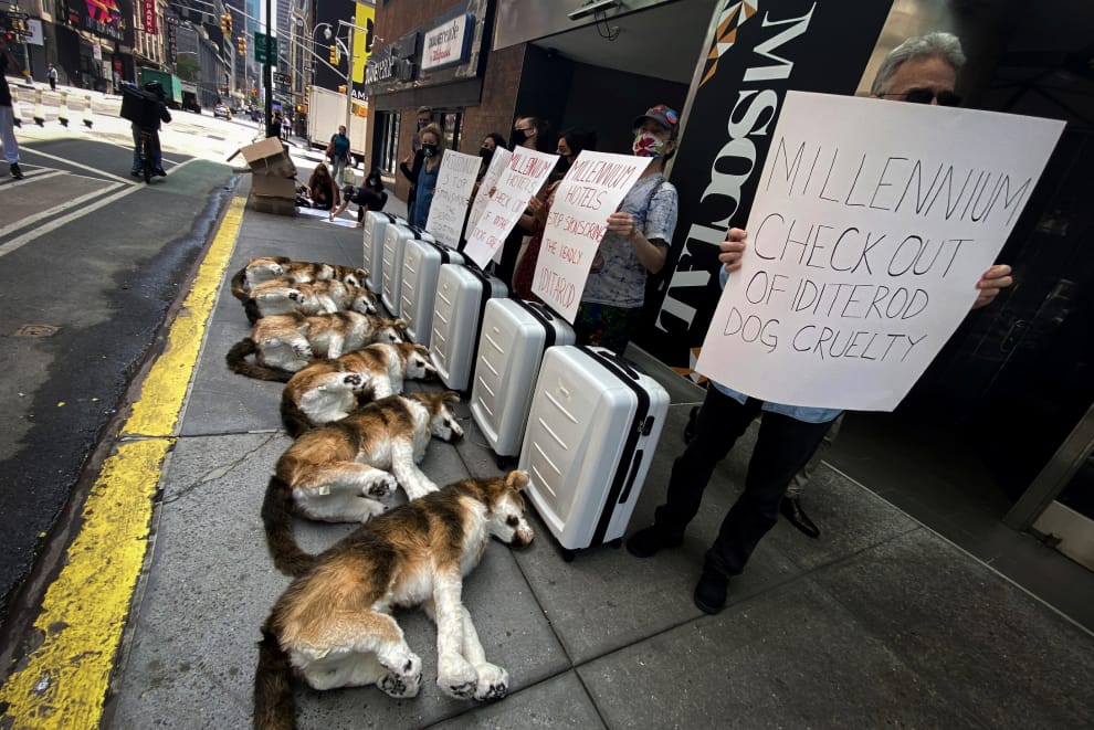 在位於時代廣場(Time Square)的酒店「M Social Hotel」外,善待動物組織(PETA)帶著手寫看板站在一排填充狗娃娃和行李箱後方,抗議千禧酒店及度假村(Millennium Hotels and Resorts)不該贊助艾迪塔羅德狗拉雪橇比賽(Iditarod Trail Sled Dog Race)。