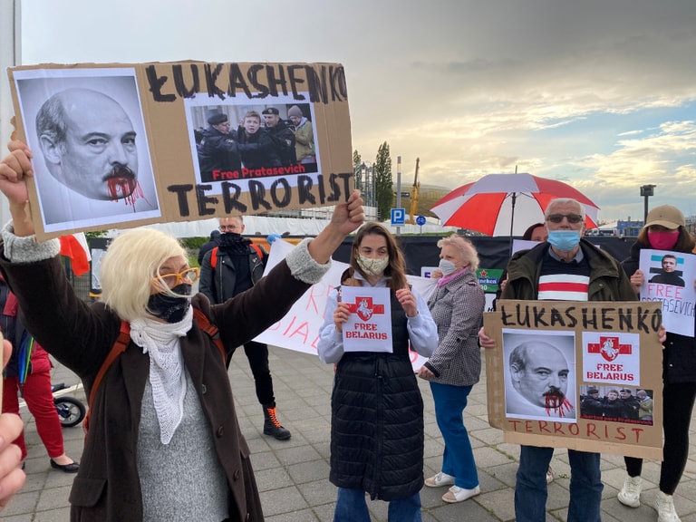 在格但斯克(Gdansk),一群民眾來到舉辦 2021年歐足總歐洲聯賽(UEFA Europa League)決賽的格但斯克能源體育場(PGE Arena Gdansk)外聲援被捕的白羅斯記者普羅塔賽維奇(Roman Protasevich),希望藉此引起國際關注。