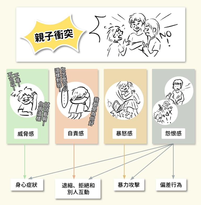 2013 年葉光輝團隊研究發現,親子衝突帶來的負面情緒,會造成青少年各項問題行為,而且不同類型的負面情緒會導致不同的問題行為。常見的負面情緒有: