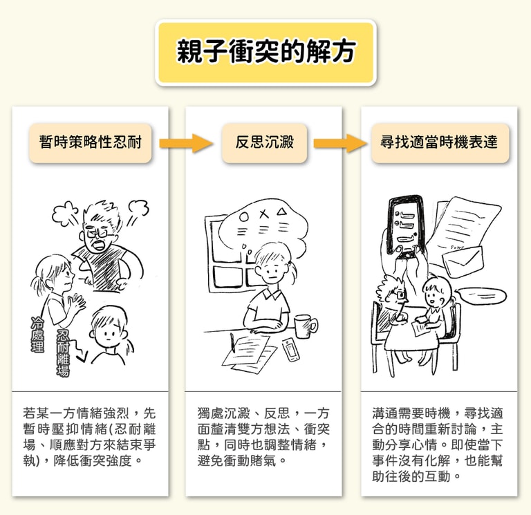 華人所熟悉的忍,固然可以在衝突當下緩解彼此的情緒,但葉光輝指出,這應該只是暫時性、策略性;更重要的是在情緒冷卻後,尋找適當時機溝通。「先忍耐、後溝通」是適當表達策略的核心精神,不管父母或子女皆適用。