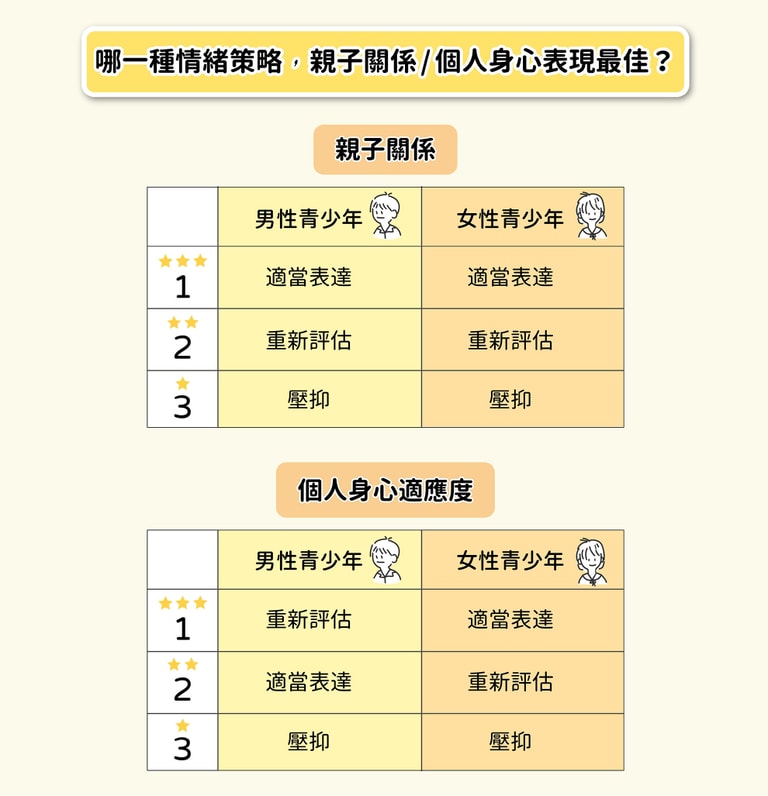 在親子關係上,採取「適當表達」策略的青少年和父母關係最好,其次為「重新評估」,最差則是「壓抑」。在個人的身心適應度,「適當表達」、「重新評估」差異不大,「壓抑」型的青少年自我感覺最差。