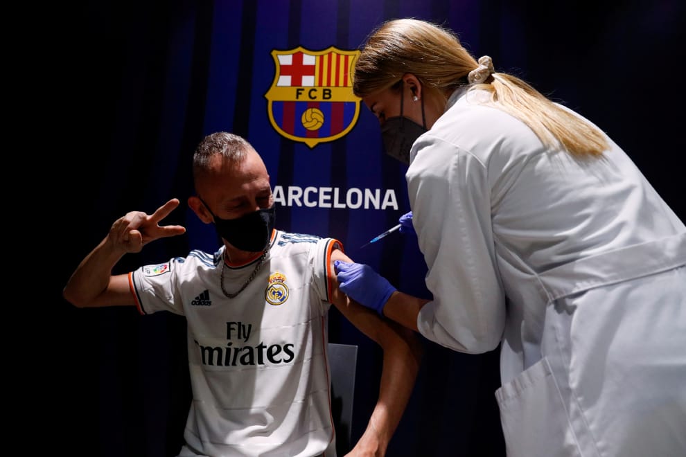 在巴塞隆納的諾坎普球場(Camp Nou stadium),也就是巴塞隆納足球俱樂部(FC Barcelona)的主場,一名穿著皇家馬德里足球俱樂部(Real Madrid)球衣的男子正在施打輝瑞(Pfizer-BioNTech)疫苗,悠哉的他在打針的同時還不忘對著鏡頭比「YA」。