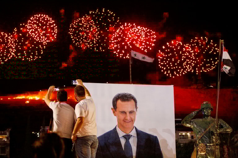 敘利亞現任總統阿塞德(Bashar al- Assad)在本月 26號的大選中,成功贏得他的第四次任期。本照攝於敘利亞首都大馬士革(Damascus),畫面中,阿塞德的支持者正站在他的海報旁邊,歡慶他的勝選。