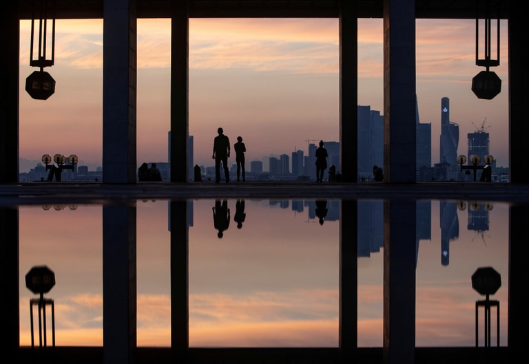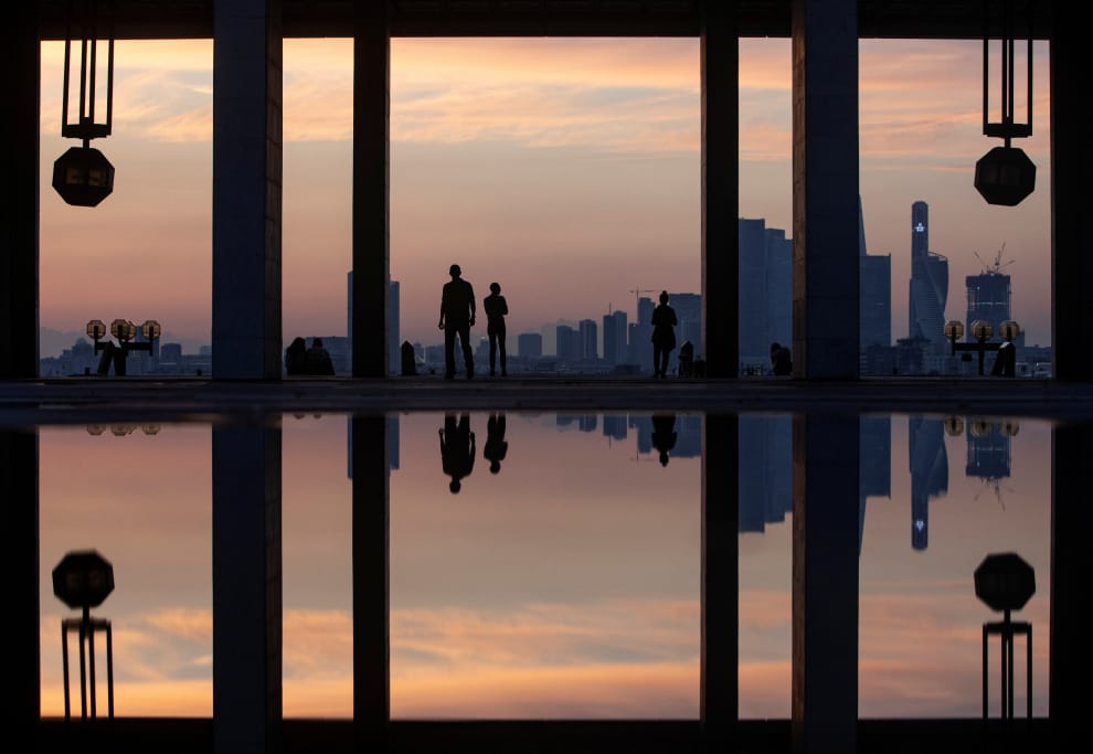 在莫斯科,幾位民眾正站在街頭凝視夕陽西下的天空,他們的身影都倒映在了一旁的水面上。